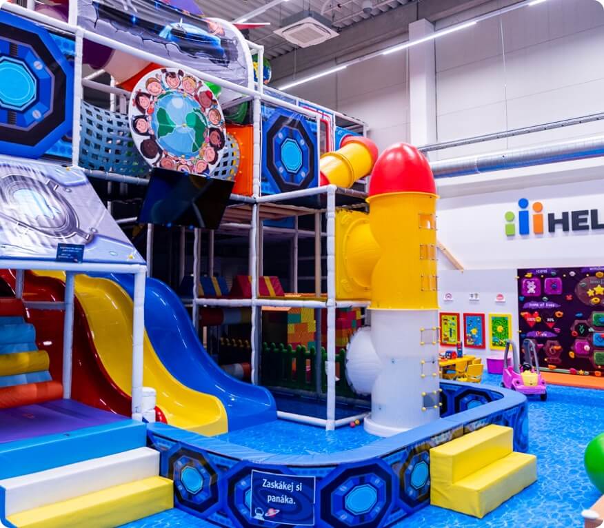 Centrum je tvořeno třípatrovým prolézacím labyrintem, dětským koutkem pro malé děti, střílecími děly.