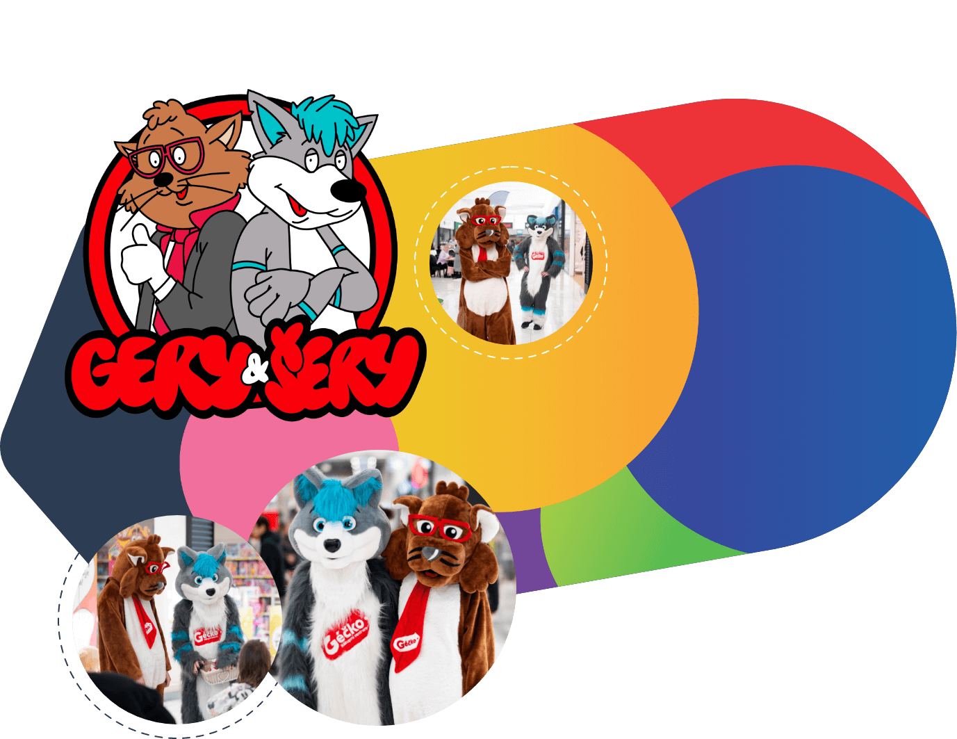 Jsme maskoti nákupního centra. Kocour GERY a pes husky ŠERY! Můžete se s námi potkat na akcích, které pro Vás Géčko připravuje. Dostanete od nás vždy drobný dáreček, a můžeme se společně i vyfotit. Nebojte se nás, jsme moc hodní a přítulní.